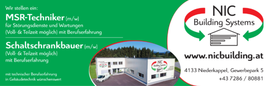 Die NIC Building Systems GmbH ist ein wachsendes Unternehmen im Bereich der modernen Mess-, Steuer– und Regelungstechnik (kurz MSR). Wir setzen seit 2012 stark auf Aspekte der Nachhaltigkeit, Energieeffizienz sowie Stärkung des regionalen und ländlichen Arbeitsraumes.